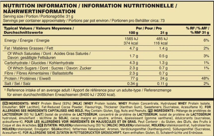 Optimum Nutrition Gold Standard Chocolate 100% Whey delivers 24g of whey protein to support muscle growth with a delicious double rich chocolate flavour. After training, your body uses protein to help repair and rebuild muscle fibres. Each great tasting serving contains 24g of premium whey protein to support muscle growth and 5.5g of naturally occurring BCAAs; all with just 1g of fat and 1.2g of sugars.