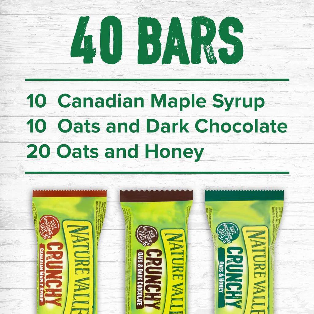 Nature Valley Crunchy cereal bars are made with wholegrain rolled oats. Variety pack includes Canadian Maple Syrup, Oats & Dark Chocolate and Oats & Honey.