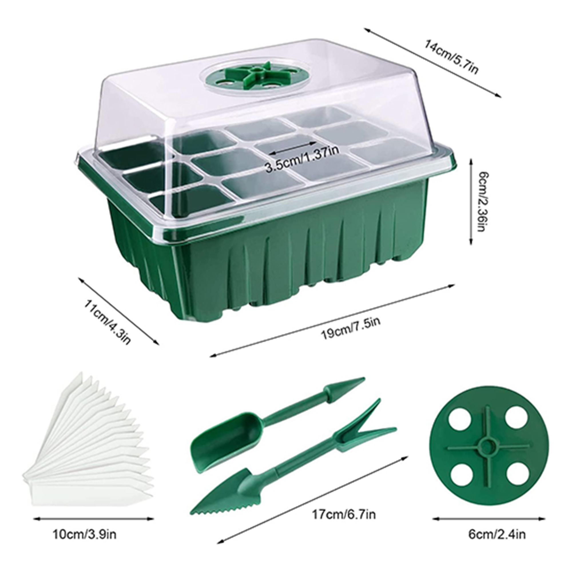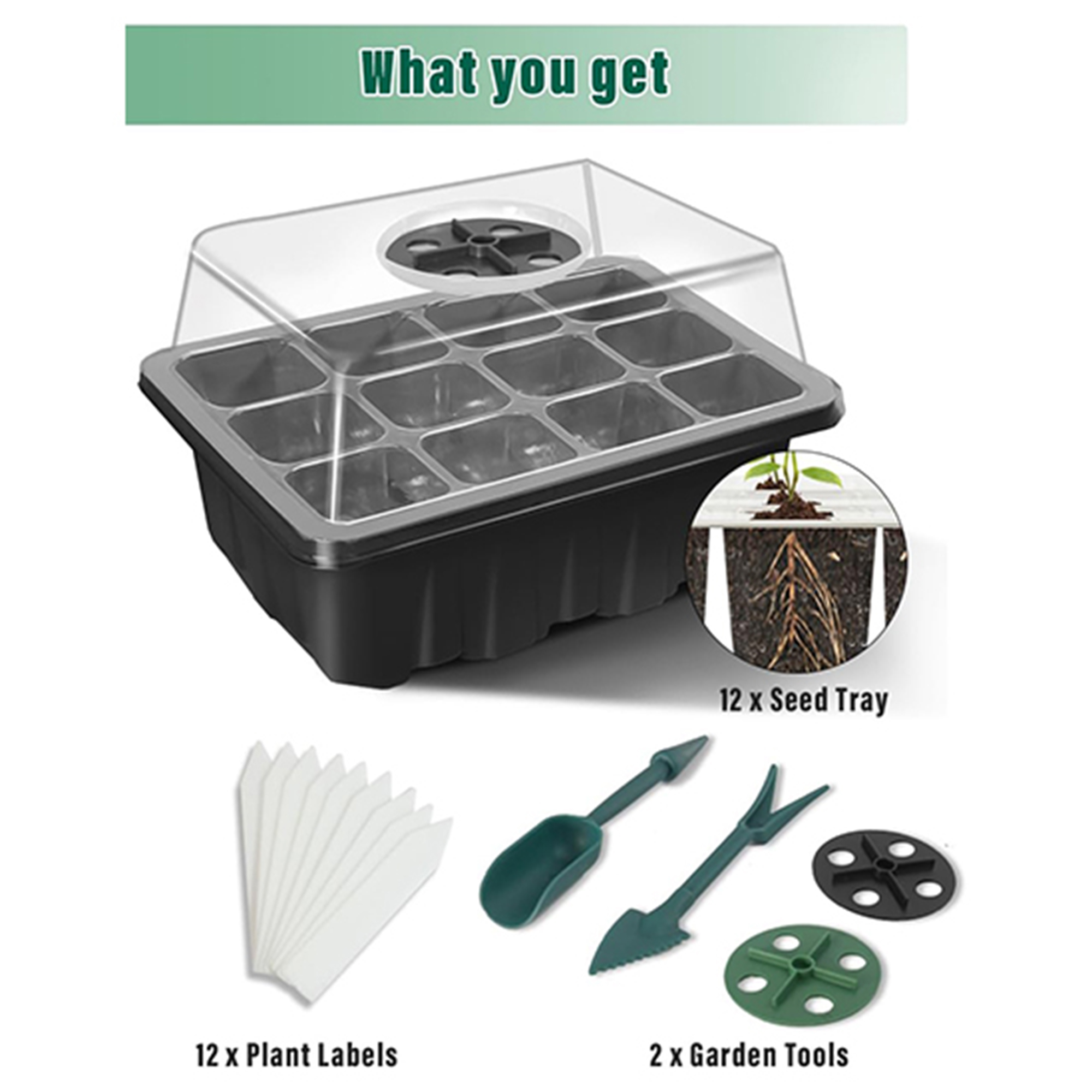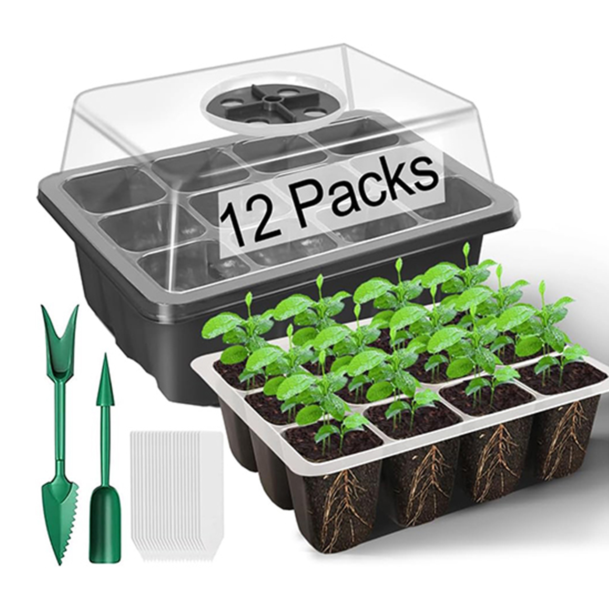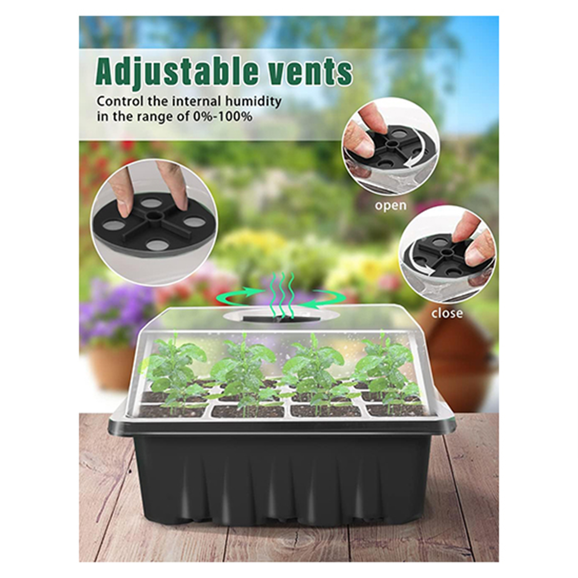 Effortlessly remove seedlings with our propagator, crafted with a flexible silicone base that safely lifts each plant without harming the roots. The silicone bottom makes repotting simple while preserving the tray’s integrity for repeated use. Built from durable PET hard plastic, the trays are significantly sturdier than comparable propagators, ensuring long-lasting performance. Featuring an adjustable vent on the lid, you can customize airflow to prevent sweating on warm days, avoid overheating, or maintain balanced humidity, functioning like a mini greenhouse to accelerate plant growth. The convenient drainage system includes a bottom hole to remove excess water and a watertight base tray to catch spills, keeping your windowsill tidy. This comprehensive 12-pack set includes 12-cell seed trays, watertight base trays, humidity domes, two gardening tools, and 12 plant labels, making it ideal for growing flowers, vegetables, fruits, and various other plants. The transparent design allows for easy monitoring of water levels, ensuring your seedlings receive just the right amount of hydration.