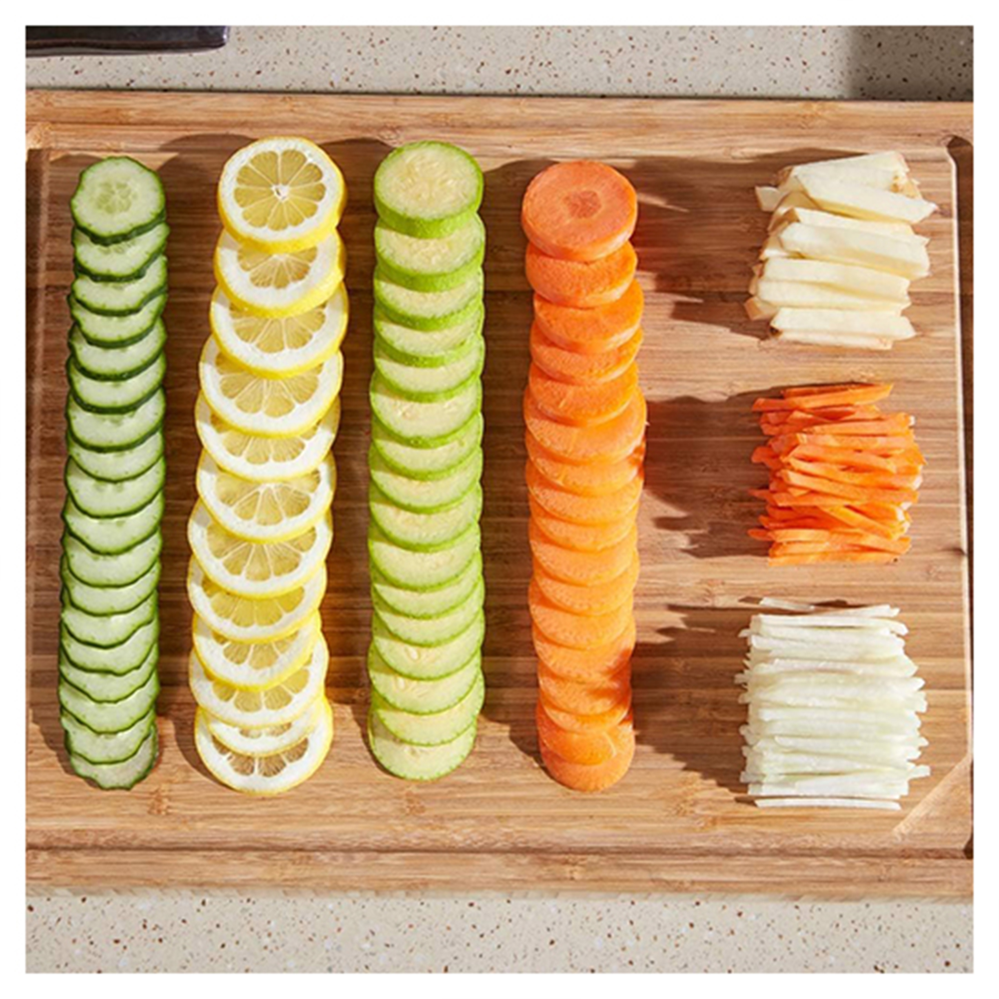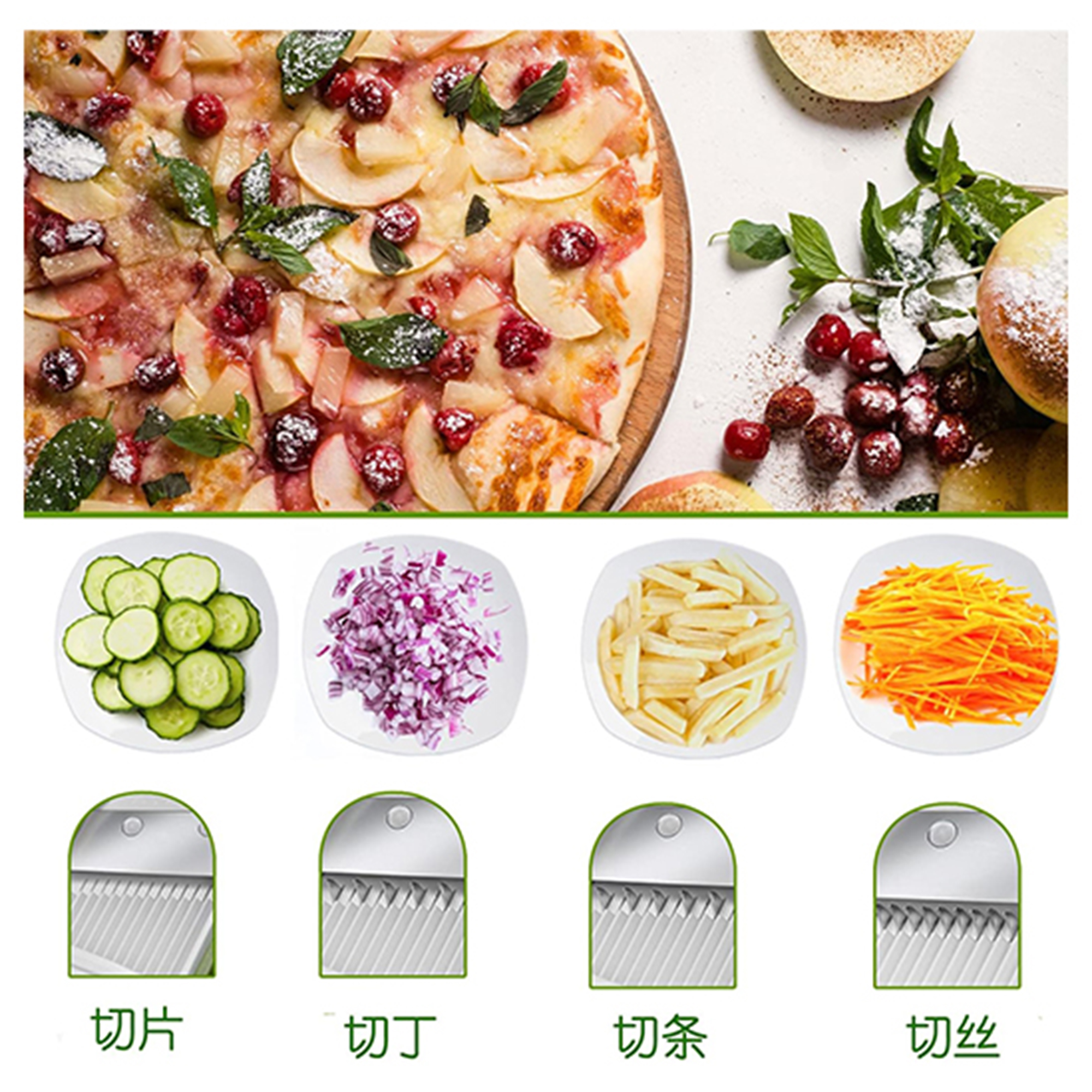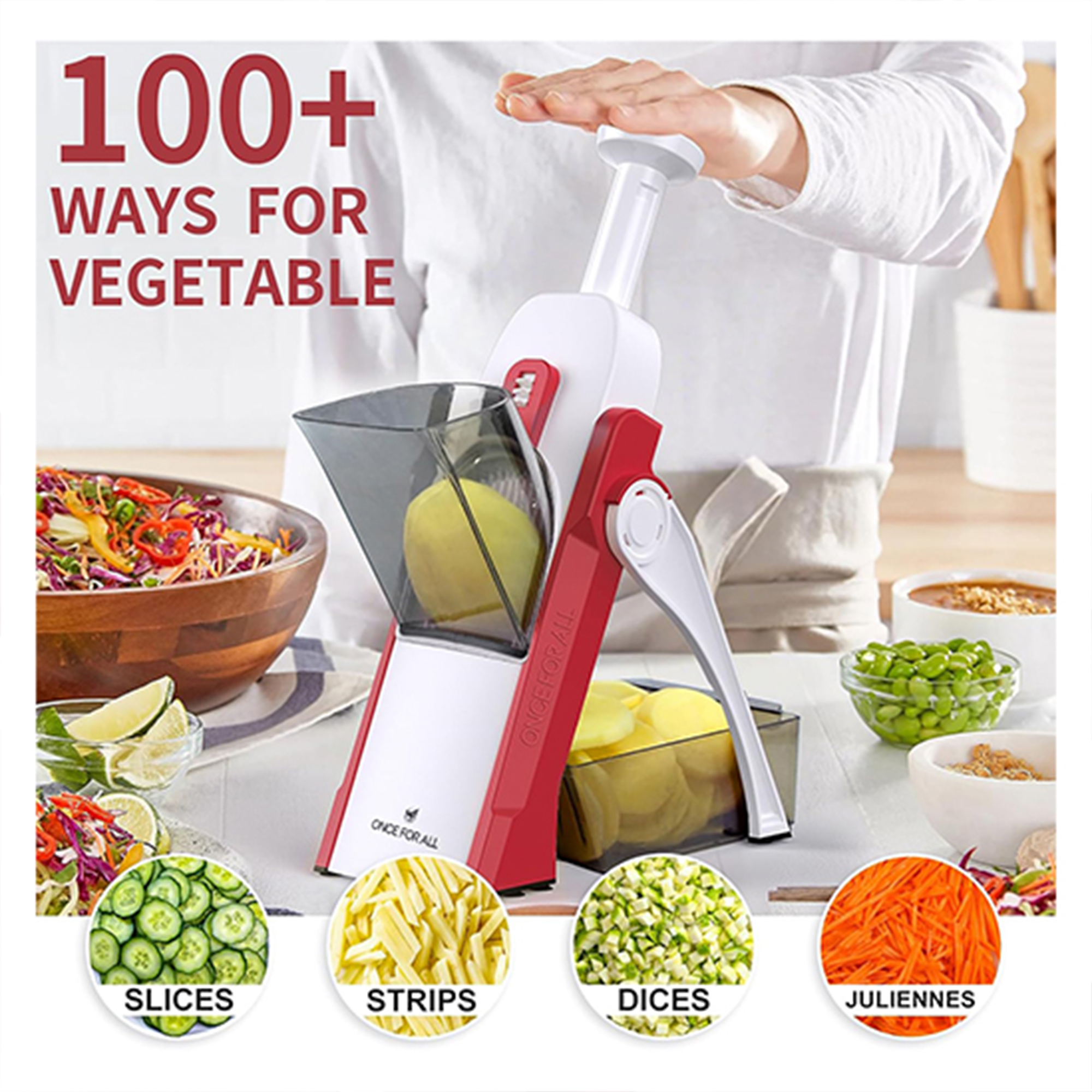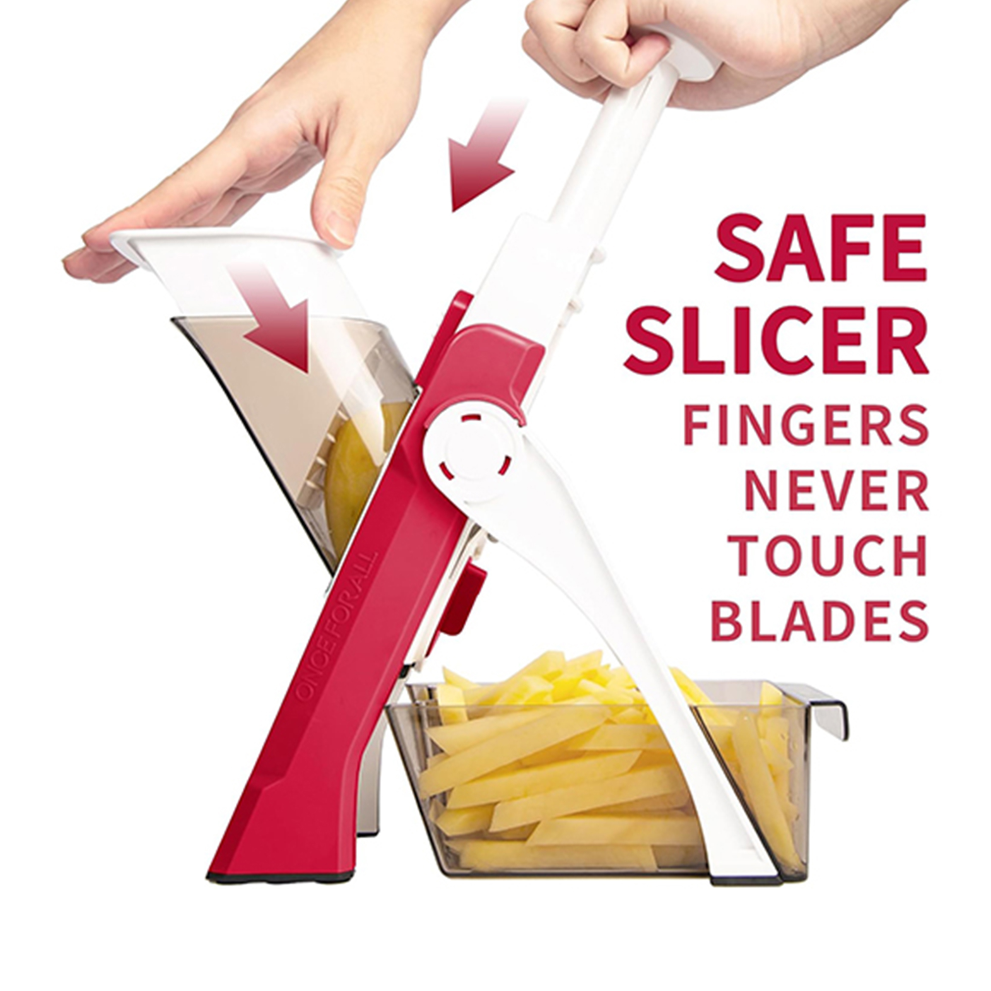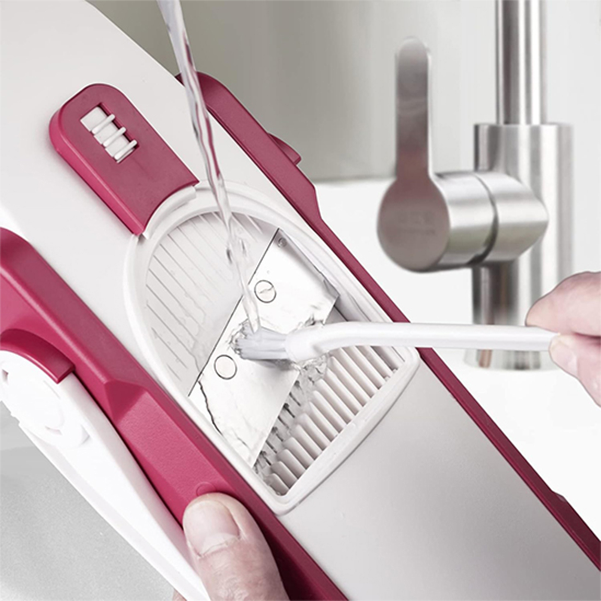 The safety mandolin slicer is designed with hidden blades for fast, uniform, and effortless slicing. It offers four versatile modes—julienne, matchstick, slicing, and dicing—without the need to change blades, making food preparation simple and efficient. With an adjustable thickness ranging from 0.1 to 8mm, it can handle a wide variety of vegetables with precision. Built with durable 420 stainless steel blades, it ensures both safety and long-lasting performance. The collapsible design makes cleaning easy, and a small brush is included for removing food residues. Compact in size, this slicer is convenient to store in any kitchen.